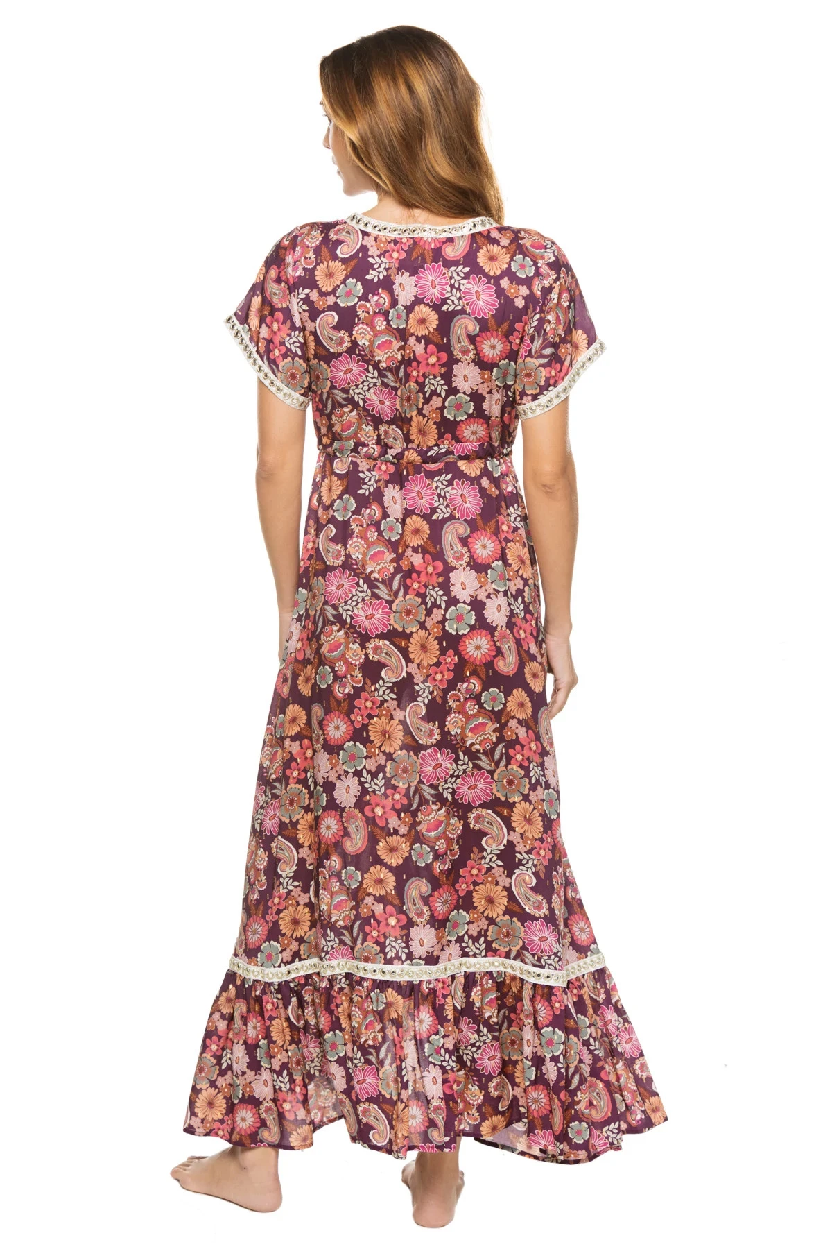 Mandy maxi dress is a real wonder featuring an empire cut that marks the waist, highlighting your figure with adjustable drawstrings, a flattering v-neckline, a flared maxi skirt with an asymmetrical flounce, and an elegant tulip hem. Sewn with signature Lace of Calais from France.