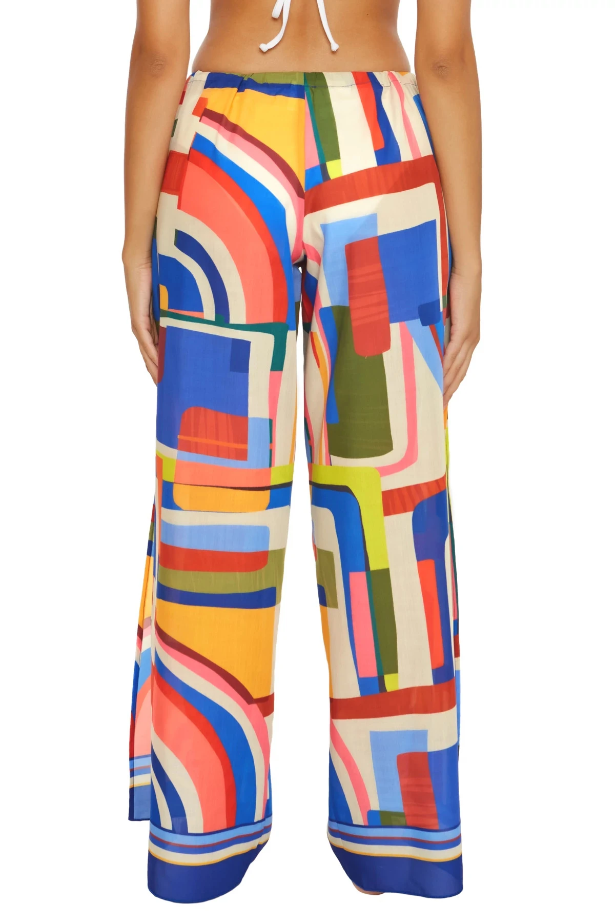Mid-Century pants features retro mod colorblock print with border stripe. Offers soft draw cord adjustable tie, has a 32″ inseam and made with recycled poly yarns.