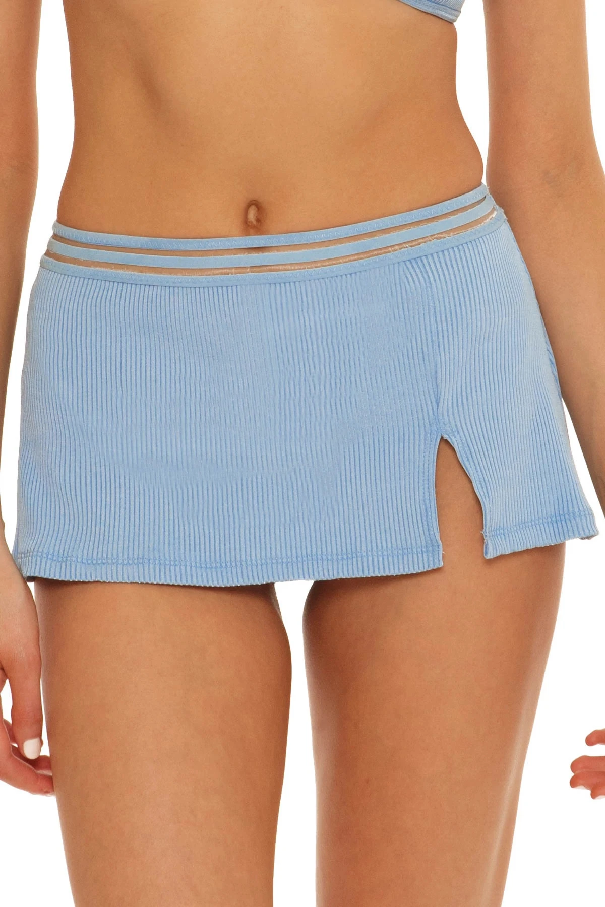 Fitted mini skirt features a thigh slit and illusion elastic waistband.