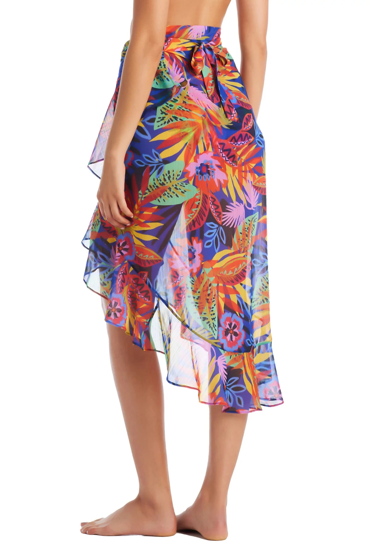 Sarong features a bright floral print with a ruffled hem detail and offers an adjustable tie at the waist.