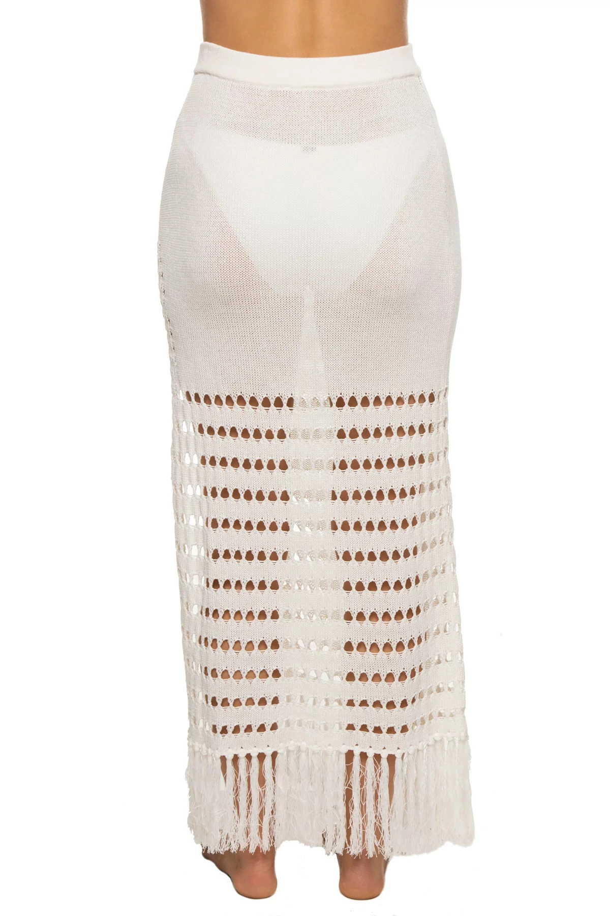 Nikki maxi skirt features a knit fabrication with a side slit, cutouts and a fringe hem.