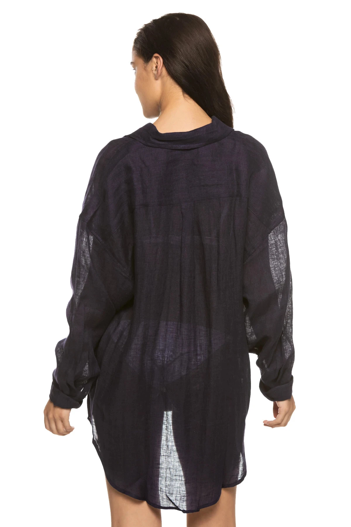 Floaty linen shirt dress – a chic, easy essential with drop sleeve, natural shell buttons. Perfect for any destination, on or off the beach.
