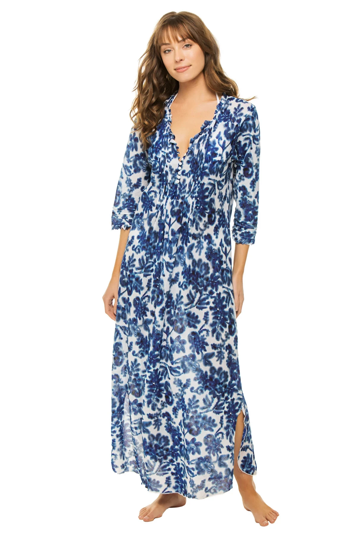 Poppy caftan features a floral print with a button up ruffle detailed v-neckline and 3/4 sleeves.