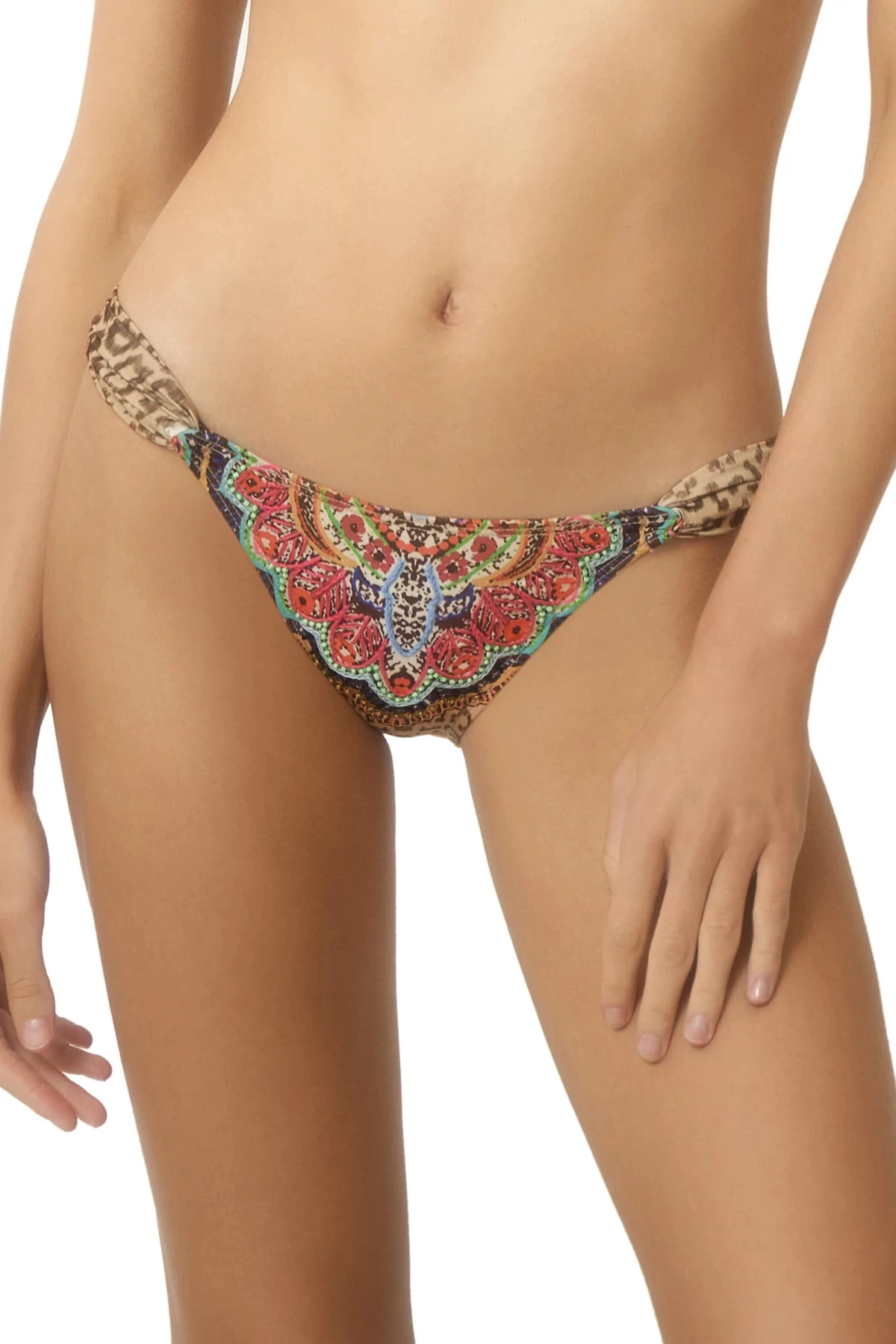 Raja hipster bikini bottom features shirred sides and offers moderate coverage.