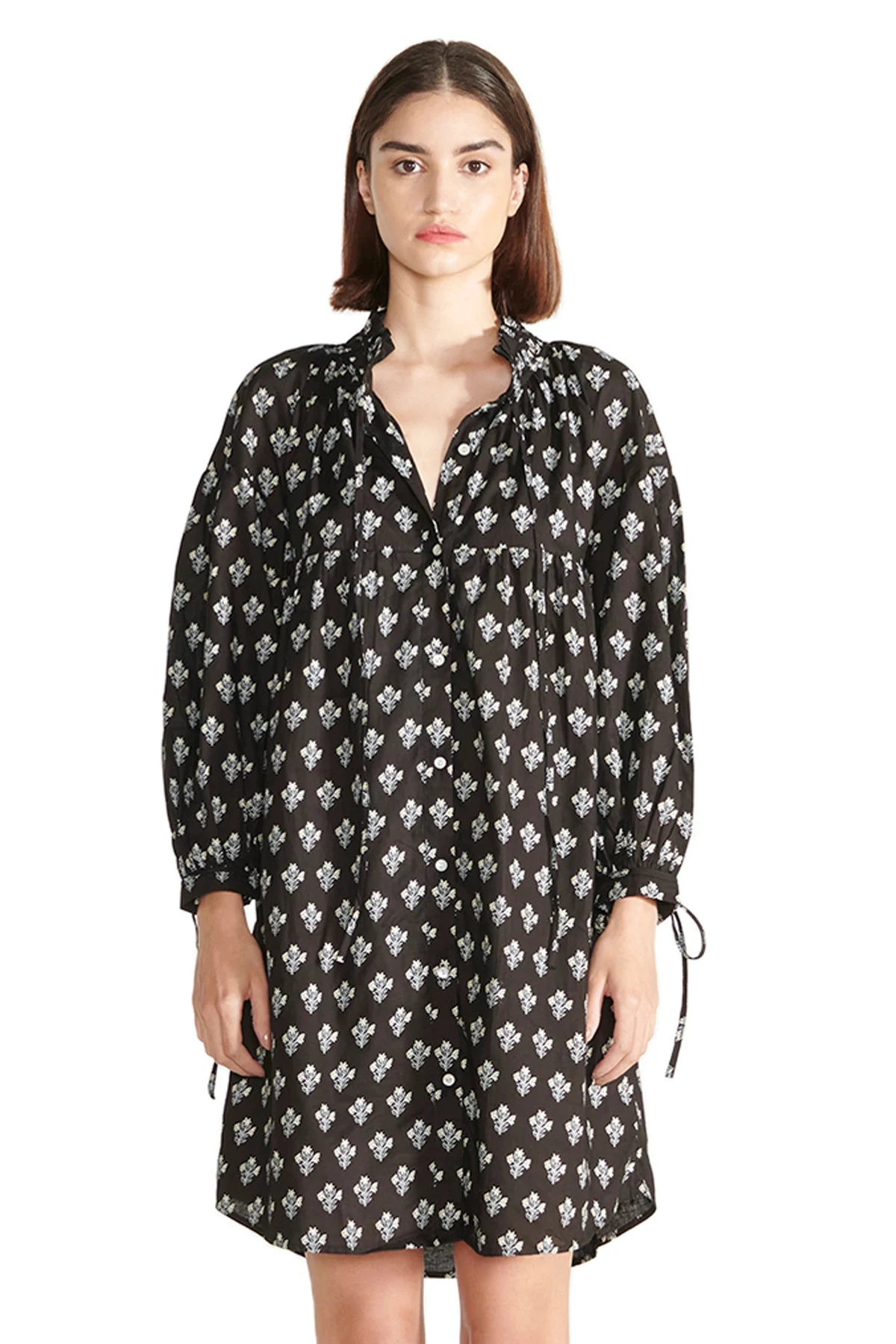 Reina shirt dress features an open neckline and long sleeves that offer ties at cuffs.