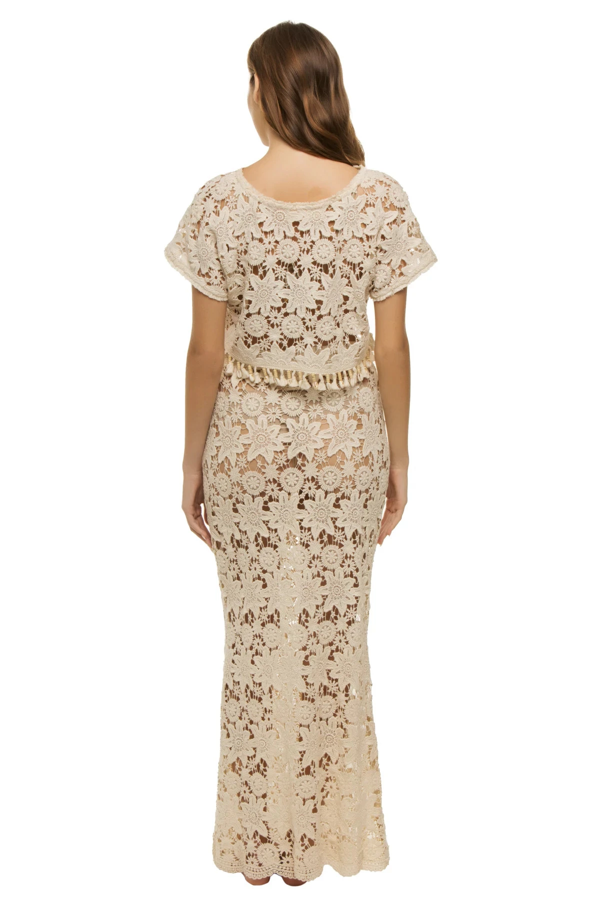 Rosie crop top features an open weave crochet and offers short sleeves and a fringe hem.