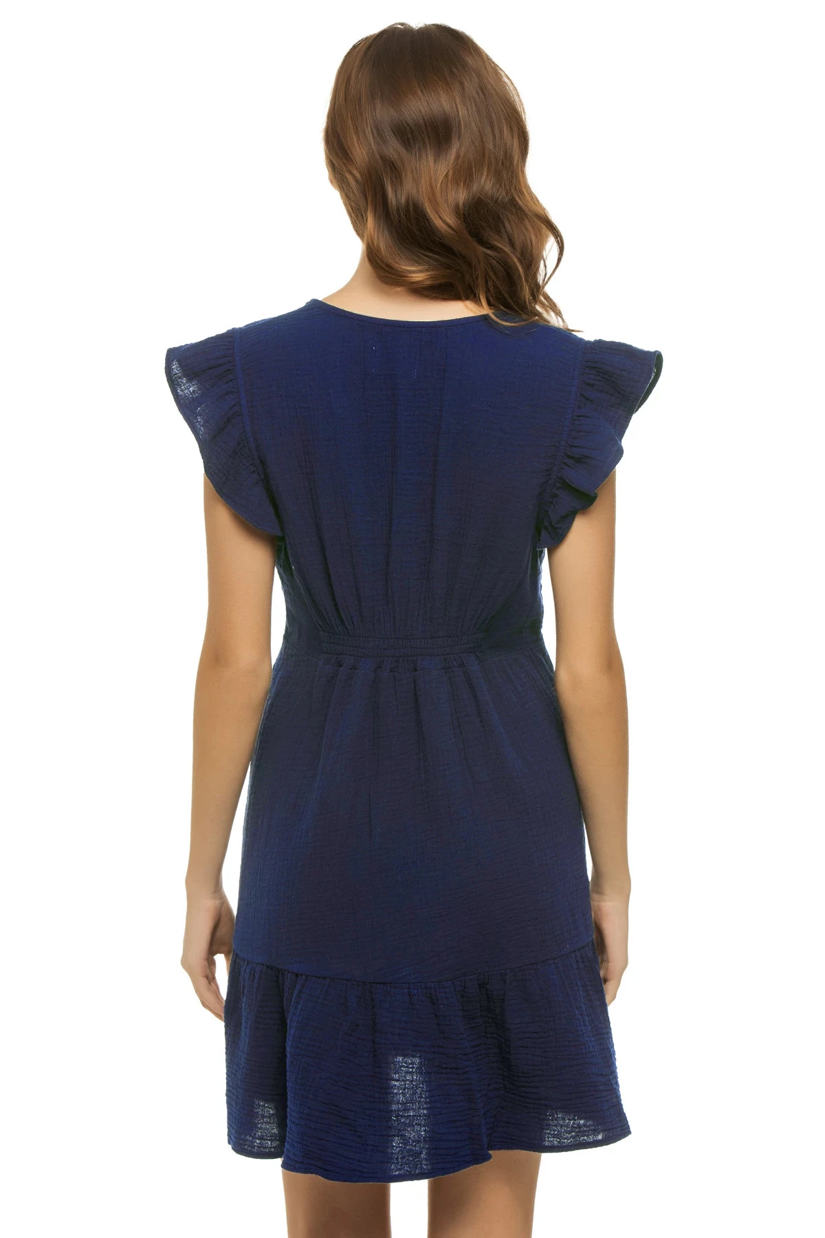 Ruby mini dress features a plunging neckline with a cinch waist, flutter sleeves and a ruffle hem skirt.