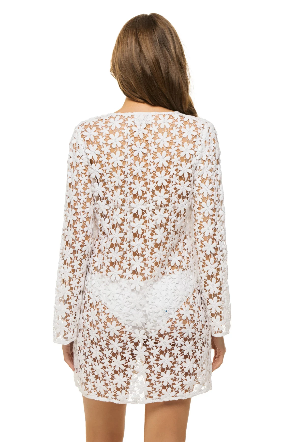 Sage mini dress features a floral open weave crochet with a split neckline and long sleeves.