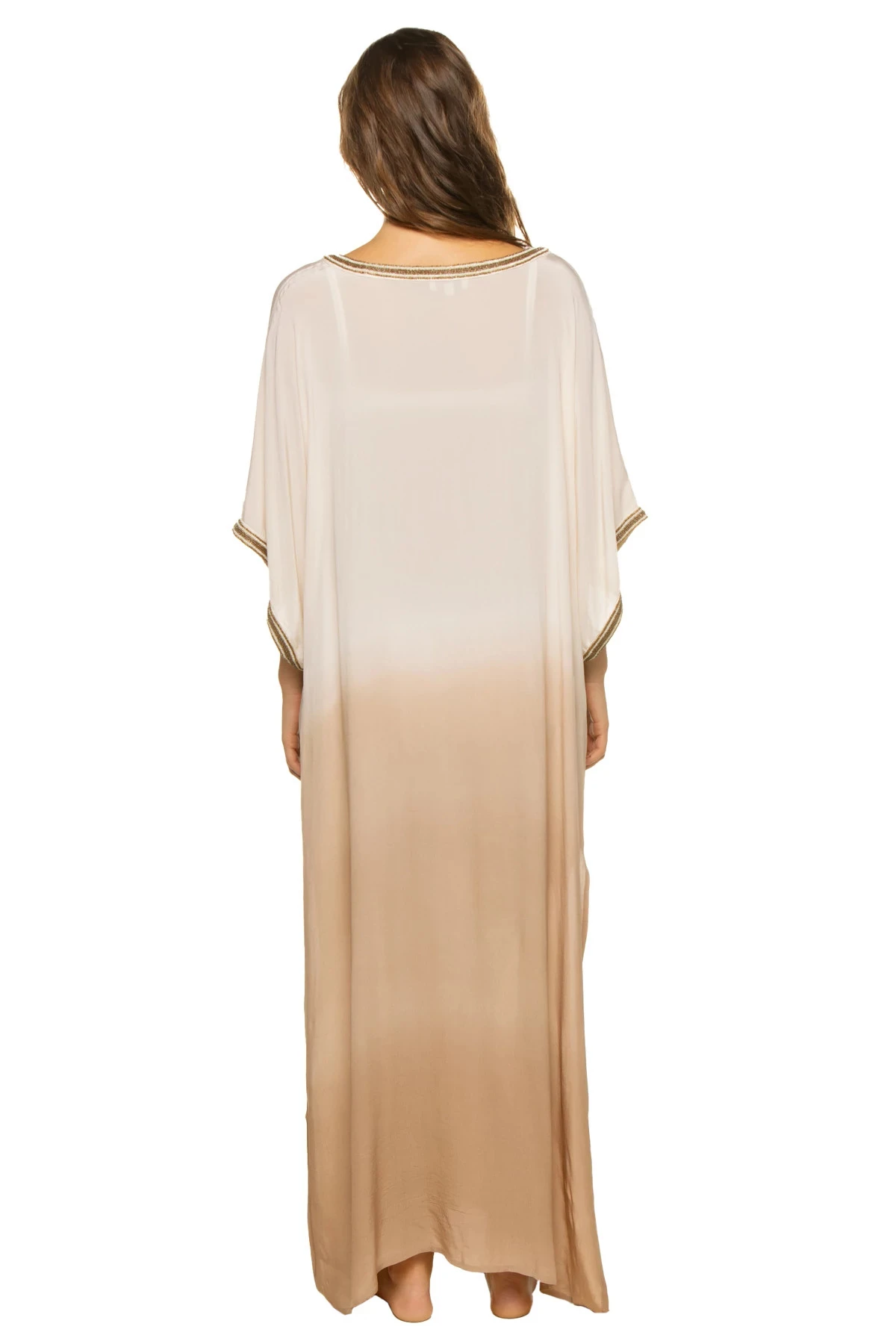 The Samira Caftan is a maxi length, relaxed fit silhouette featuring a deep v-neckline with handcrafted beaded trim. Samira is cut from a signature viscose crepe fabric that has been hand dyed to create a warm mocha ombre pattern for a smooth, silky feel that glides across the body for a lightweight wear.