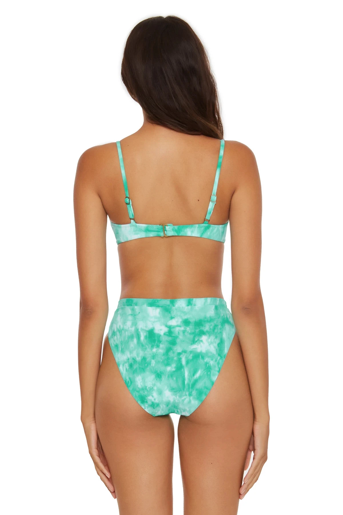 Sarah bikini top features supportive underwire with removable soft cups, seaming detail and rib textured tie dye printed fabrication in eco friendly recycled nylon yarns. Offers adjustable lingerie strap with ring and slider and a triple adjustment hook back closure.