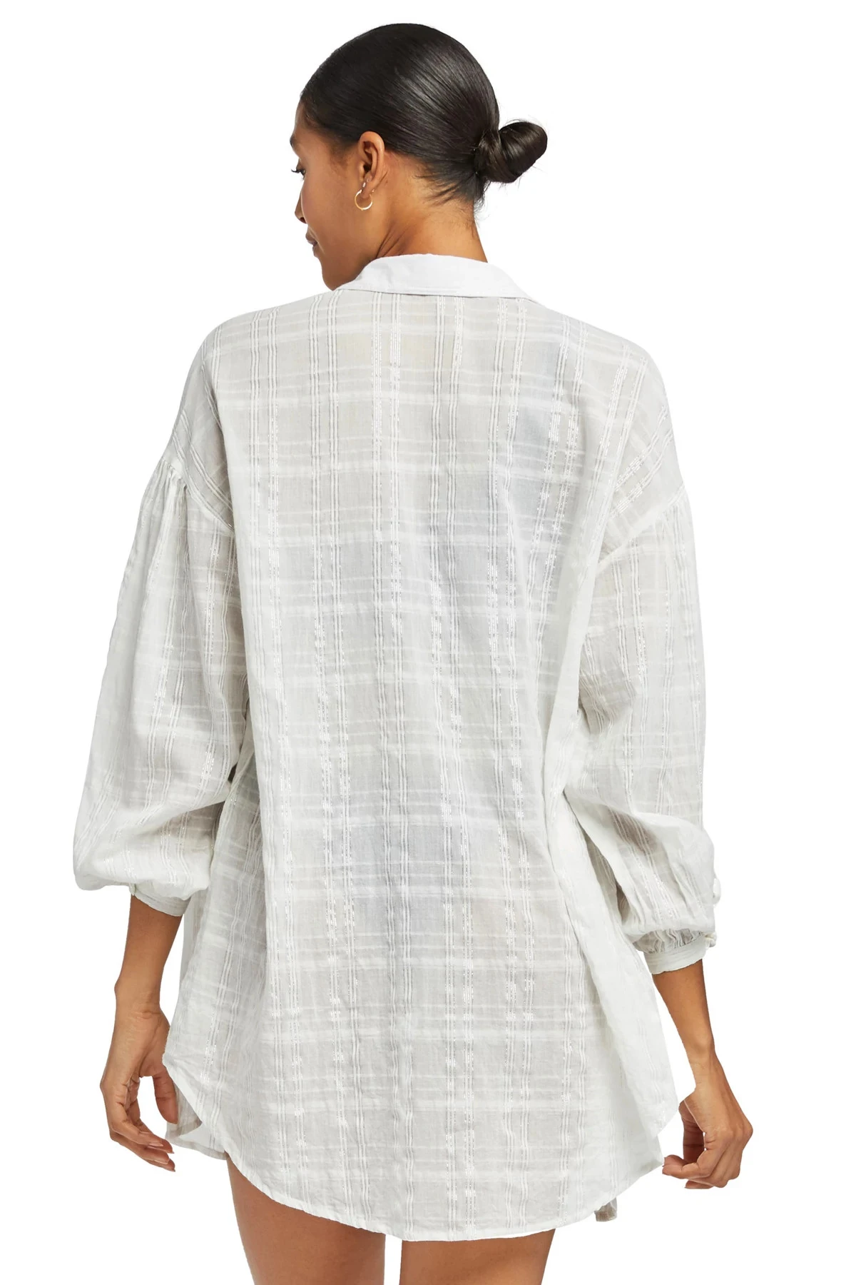 Sarita shirt dress features a lightweight fabrication with subtle metallic threading, billowy dropped sleeves and a collared neckline that offers front shell buttons.