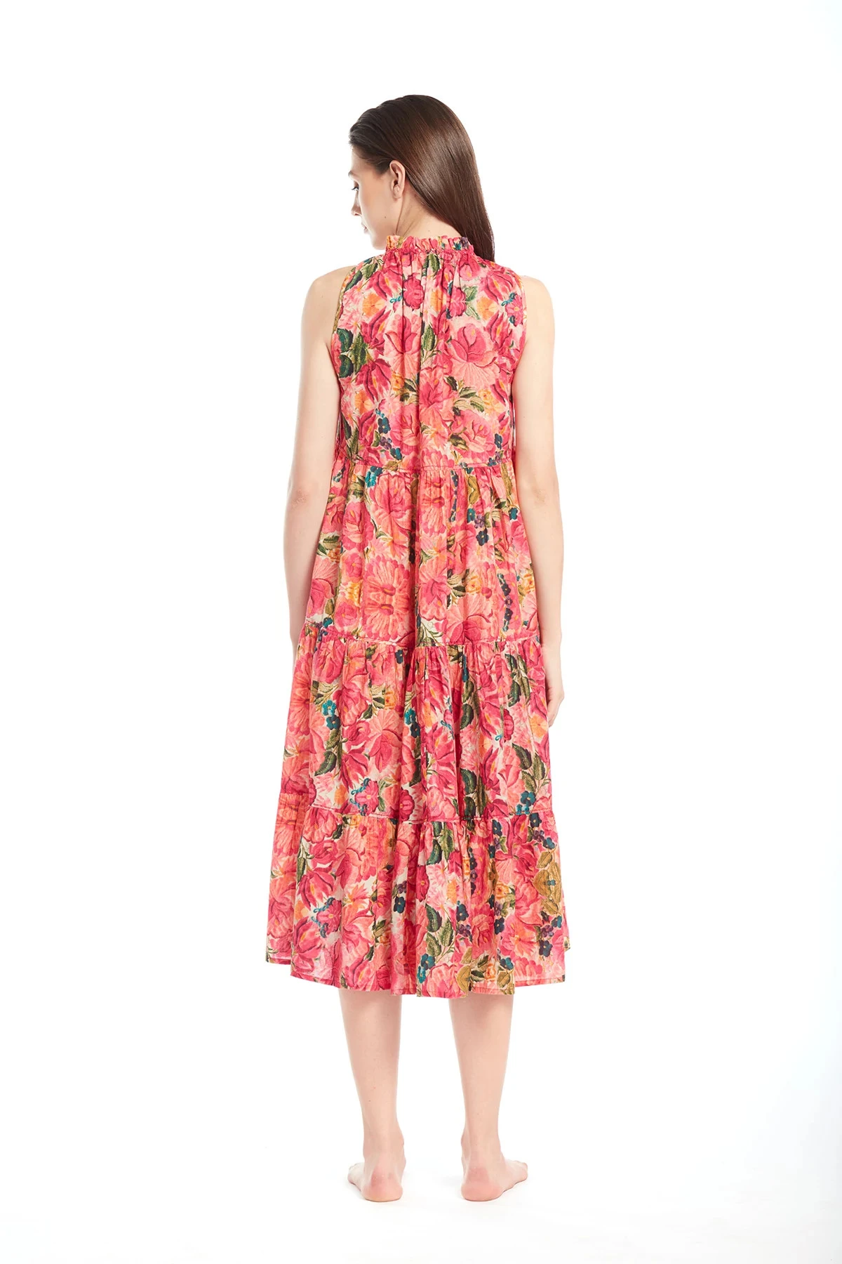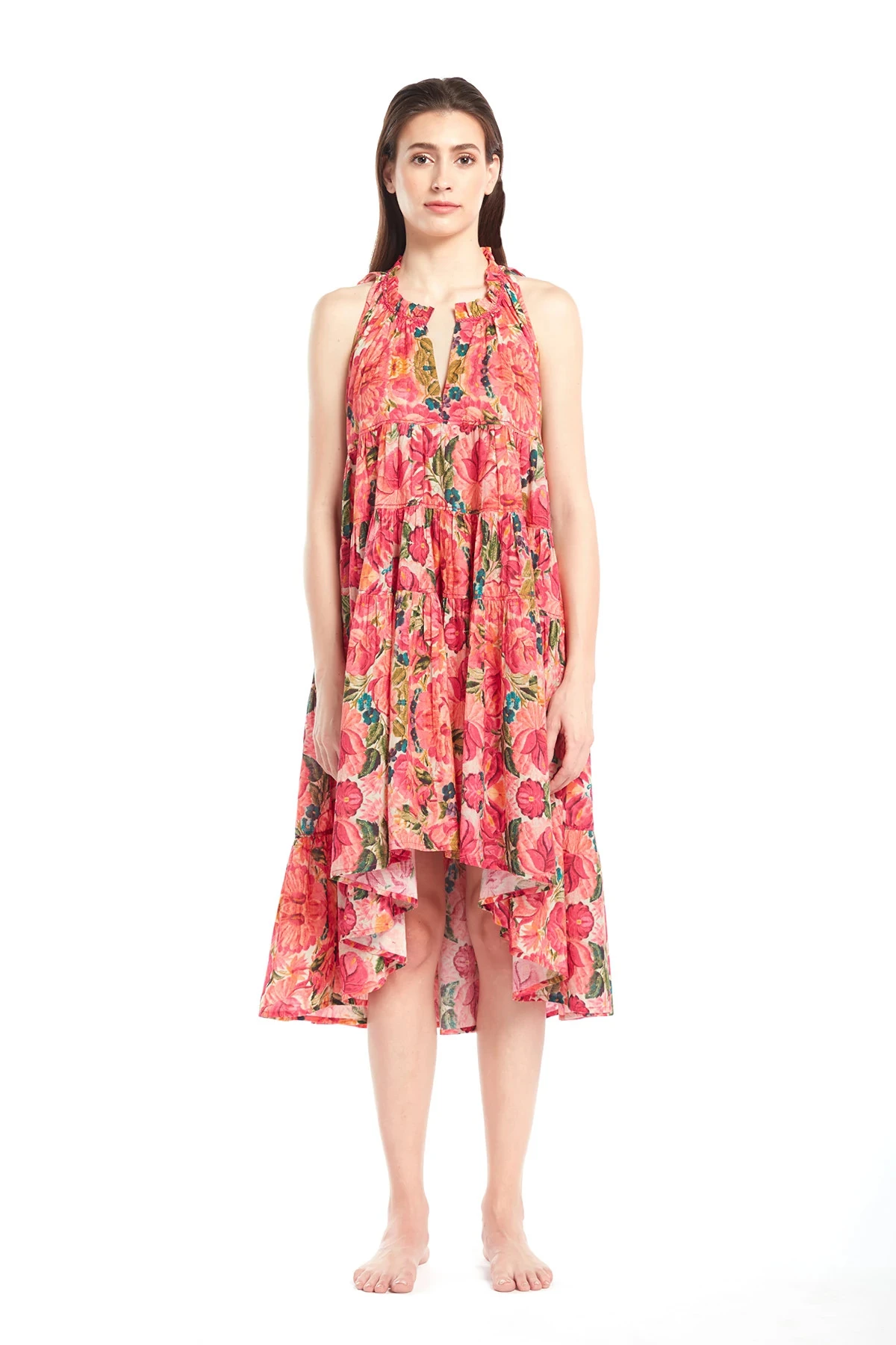 Sasha high low dress features v-neckline with ruffle collar, tiered stripe design, and flounce, high-low hem.