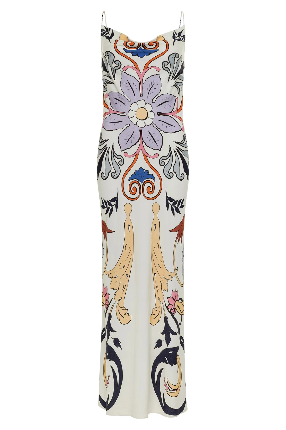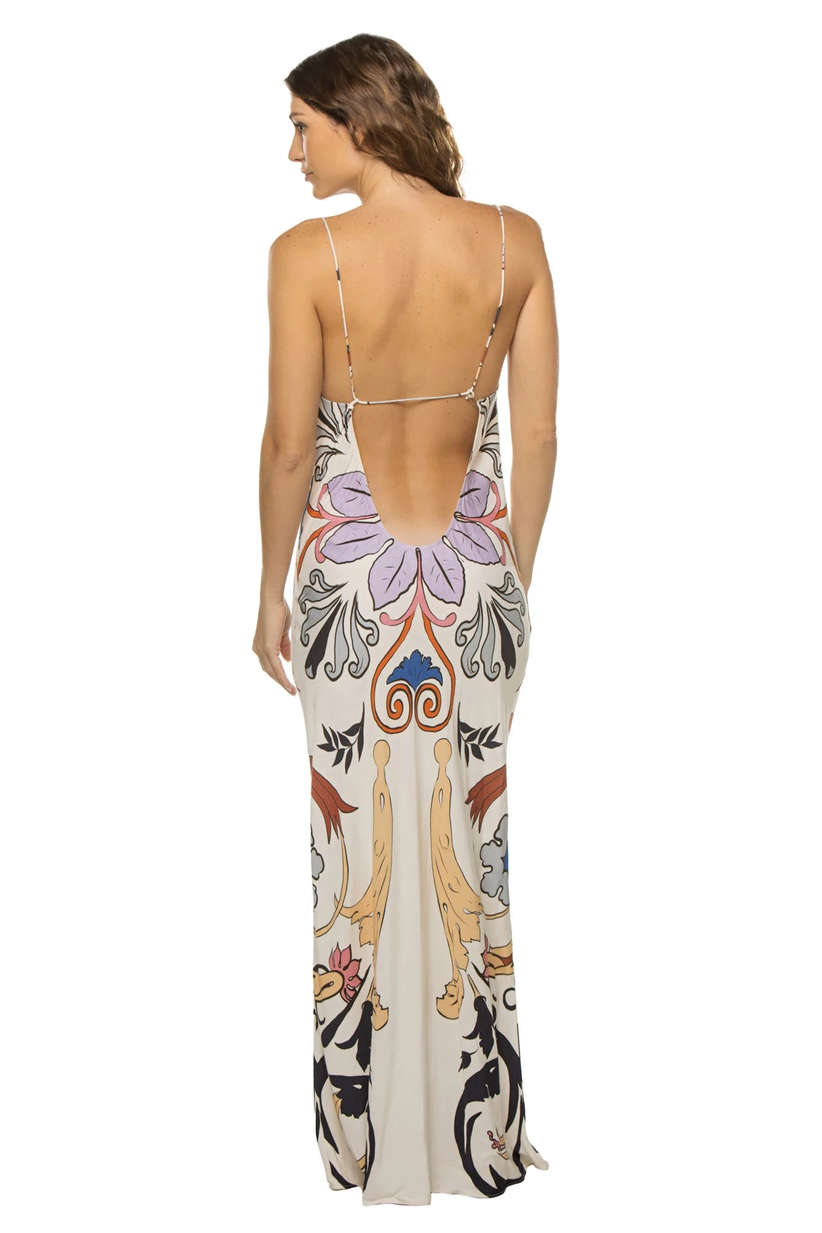 Scrolls slip maxi dress features an elegant floral print and offers adjustable tie straps with an open back.