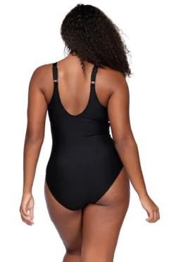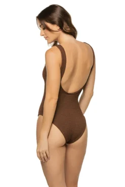 Sophie over the shoulder one piece swimsuit features a ribbed fabrication, plunging neckline and ladder cut out details at the sides. Offers an open back, high leg cut and moderate coverage.