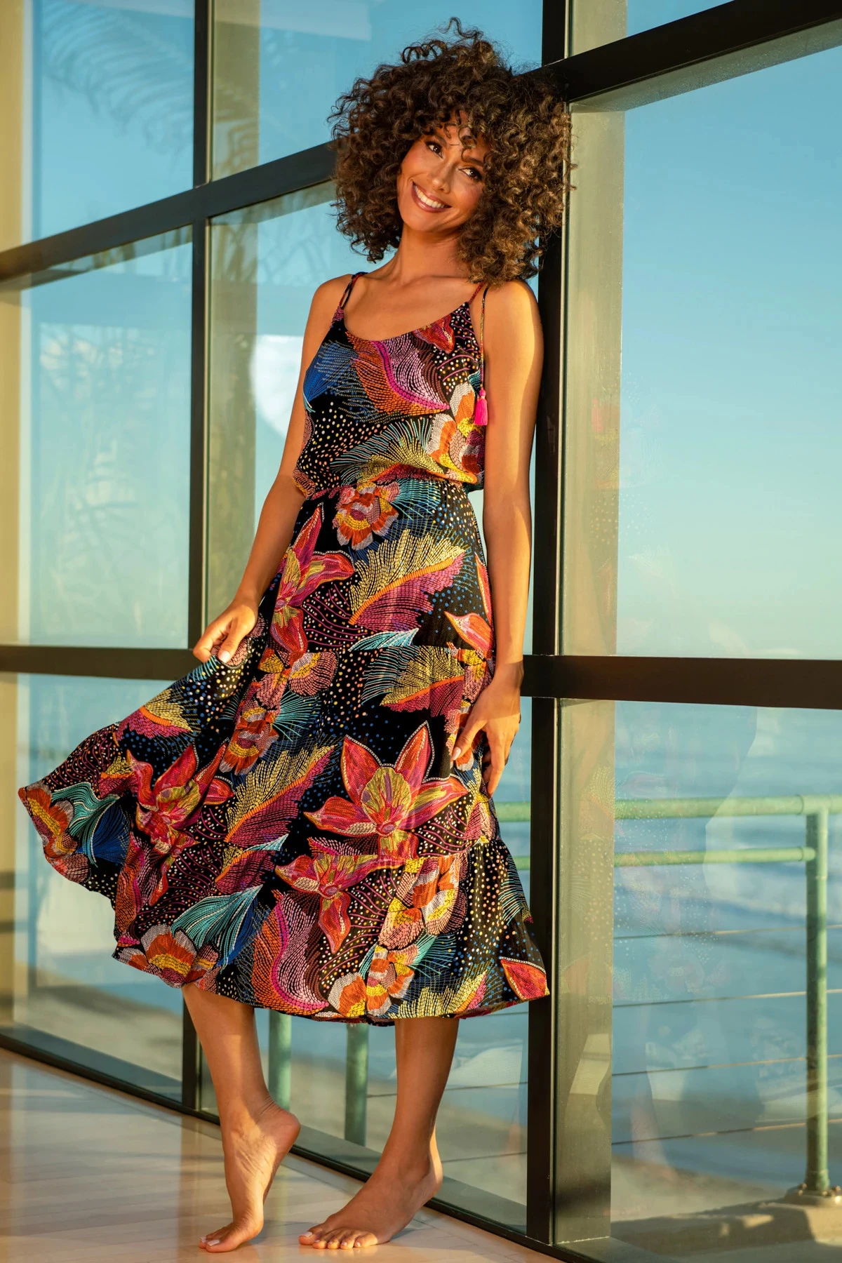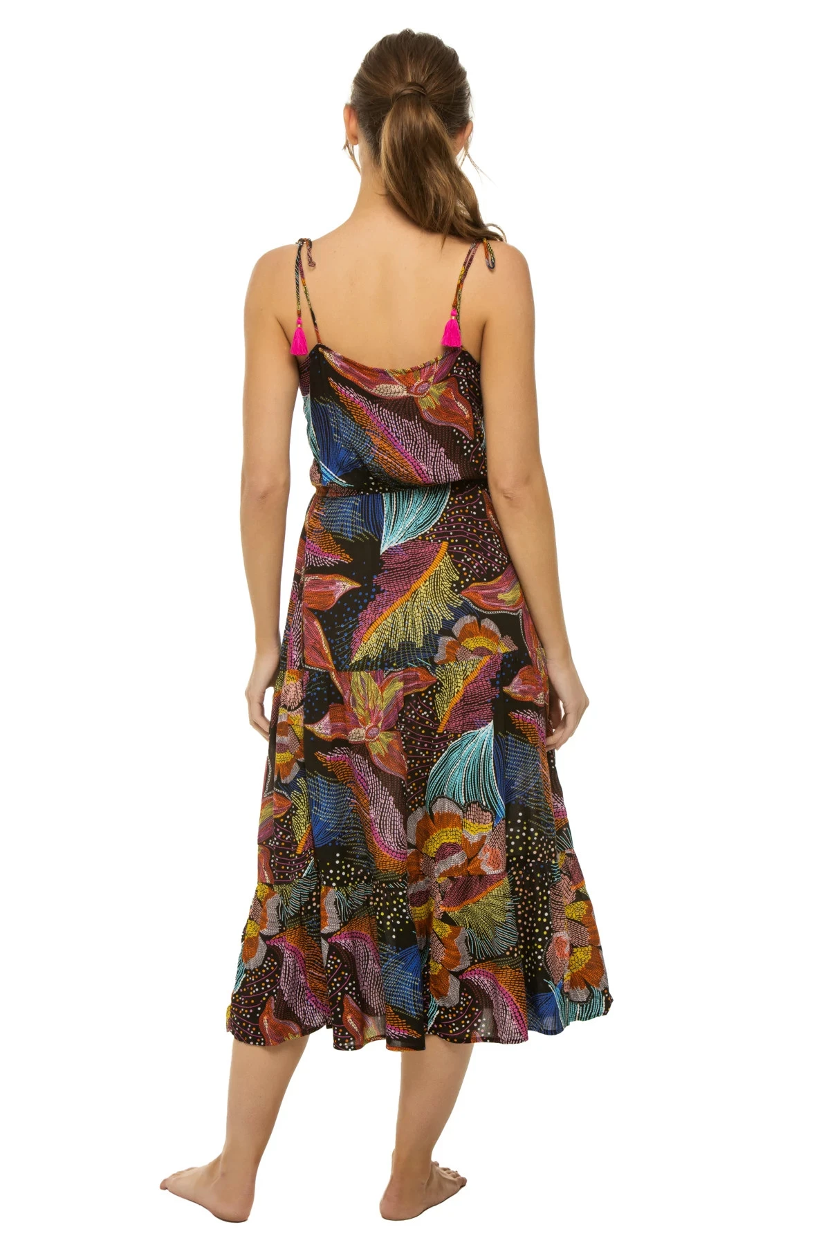 Sunlit Soiree midi dress features an elegant floral print with a tiered skirt and decorative tassels. Offers adjustable tie straps.