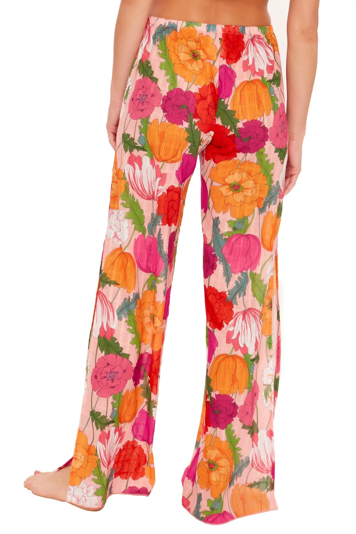 Sunny Bloom pants feature a bold floral print with side slits and offer an elastic waistband.