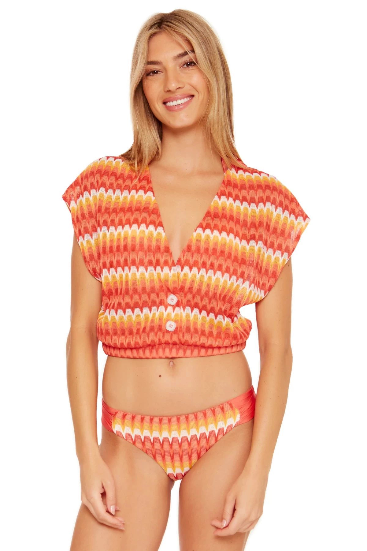 Sunray crochet crop top features a plunging neckline with an elastic waistband.