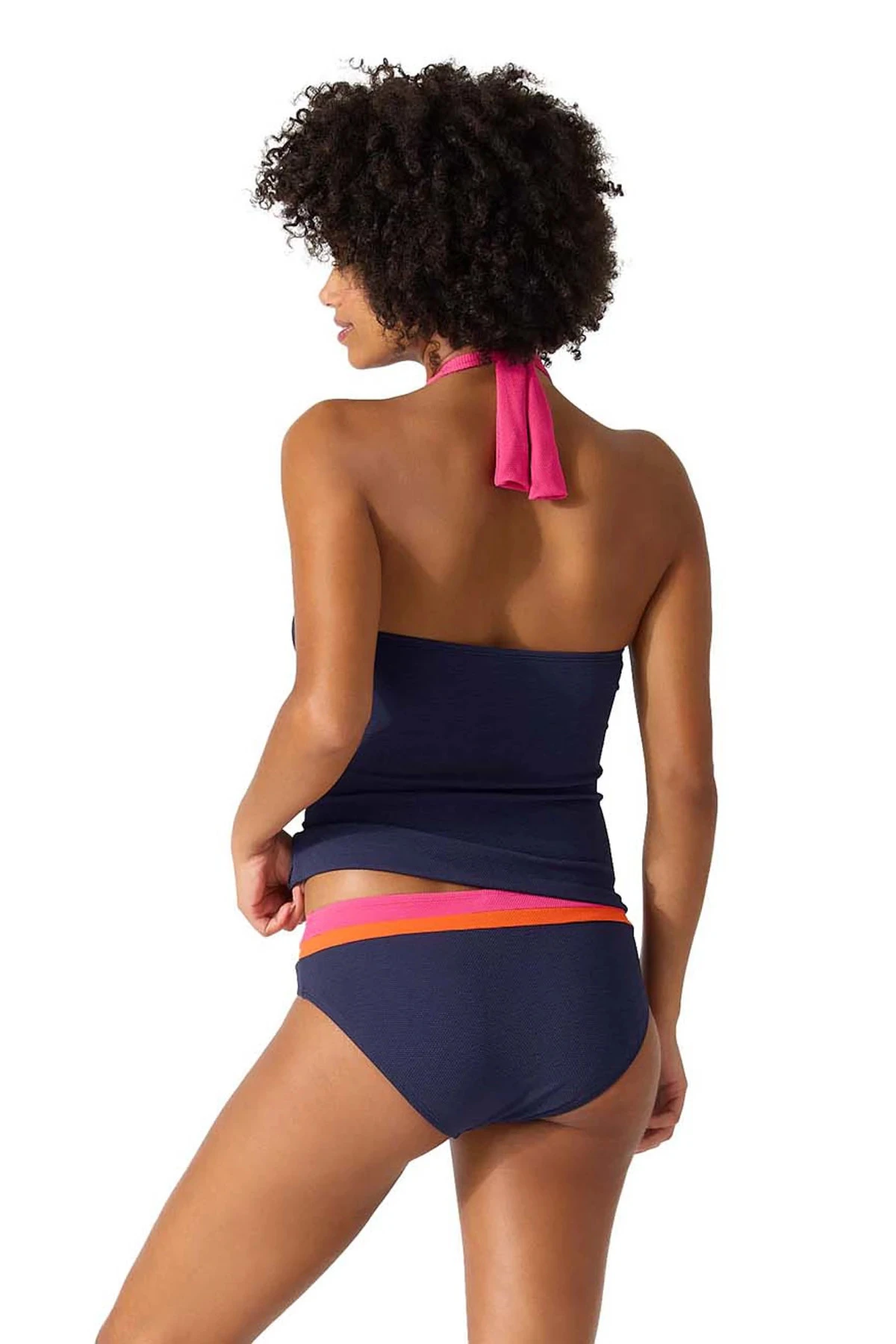 Halter tankini top features a color block texture and offers a tummy controlling bodice and adjustable neck ties.