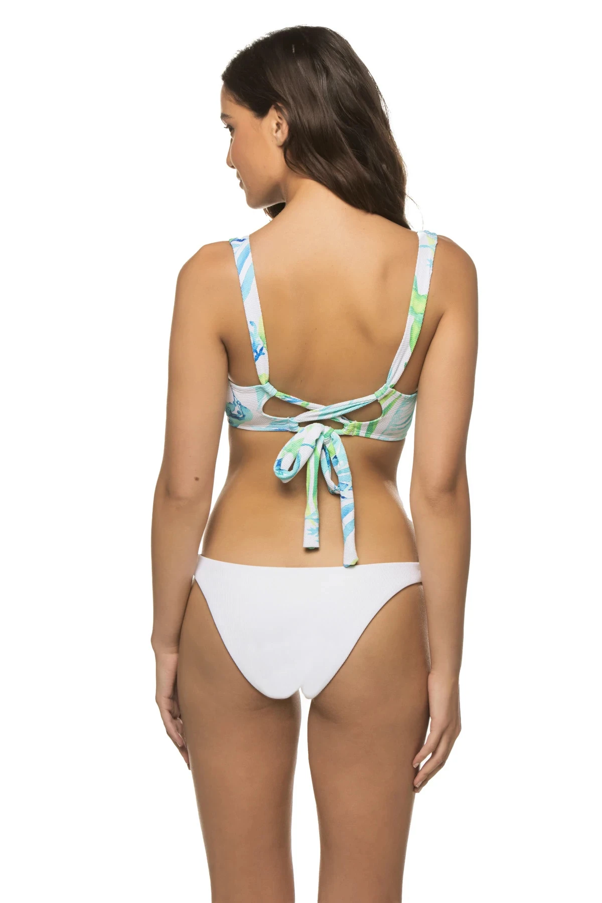 Bikini top features molded cups and offers supportive underwire and lace up ties at back.